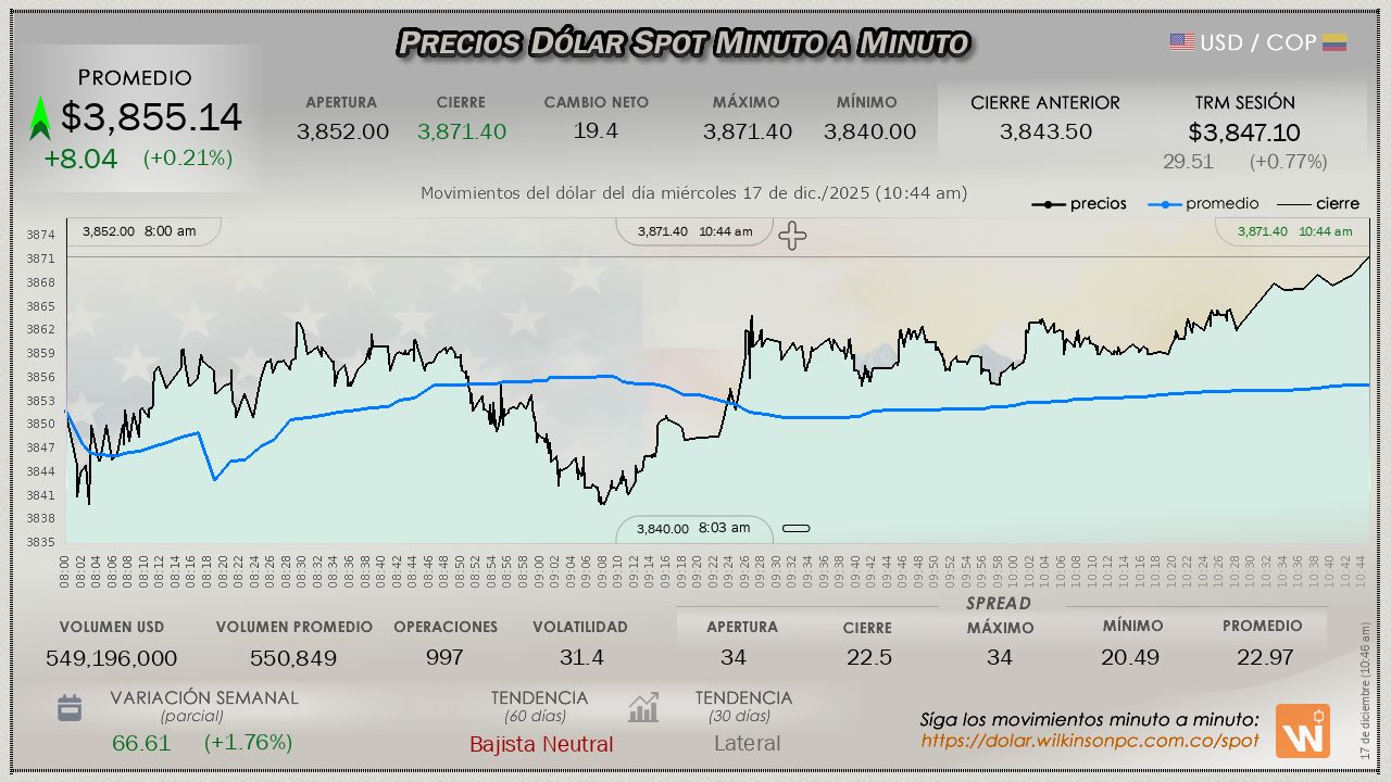 A esta hora el mercado SPOT del día miércoles, muestra un incremento consistente desde el comienzo de la jornada, con un valor corriente de $3,855.15, escasamente por arriba de los $8.05 pesos (potenciando las ganancias de la jornada previa), sobre la Tasa Representativa, que para la sesión estaba en $3,847.10.