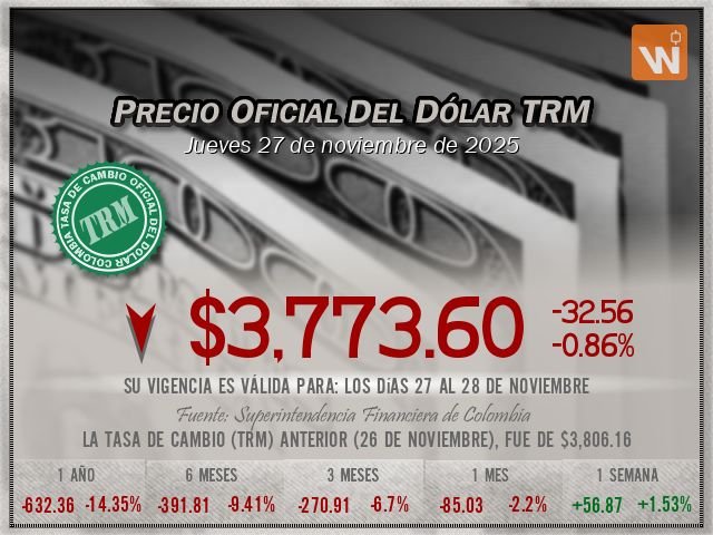 Esta es la TRM vigente del jueves 27 de noviembre de 2025, estará en efecto desde la fecha de hoy jueves, hasta el 28 de noviembre inclusive. Un (1) dólar estadounidense equivale a $3,773.60 (tres mil setecientos setenta y tres pesos con sesenta centavos colombianos).