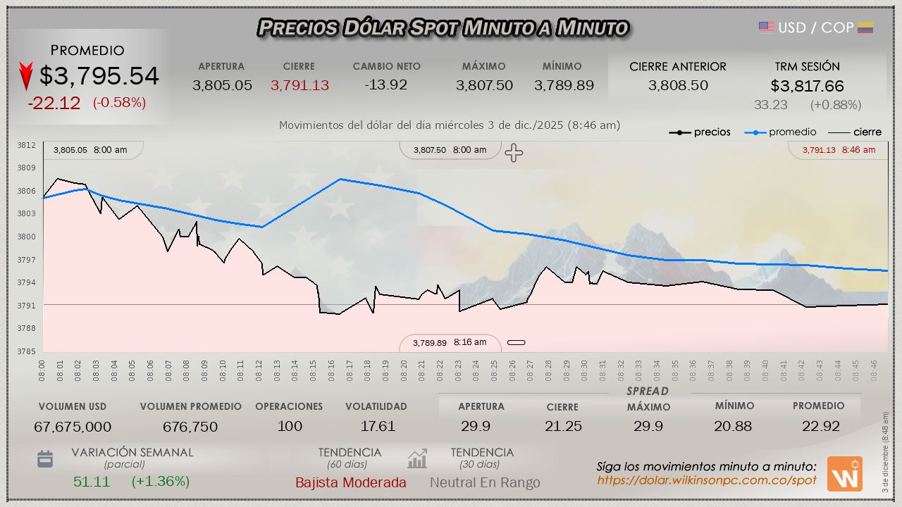En el recién iniciado mercado SPOT del miércoles (día del Médico), el dólar observa una tendencia a la baja desde el arranque de la sesión, a un precio corriente de $3,803.68, con una pequeña caída de $-13.98 pesos (a pesar del descenso, no logra disminuir las ganancias de la sesión anterior), comparada a la Tasa Representativa del Mercado (TRM), establecida en $3,817.66 pesos.