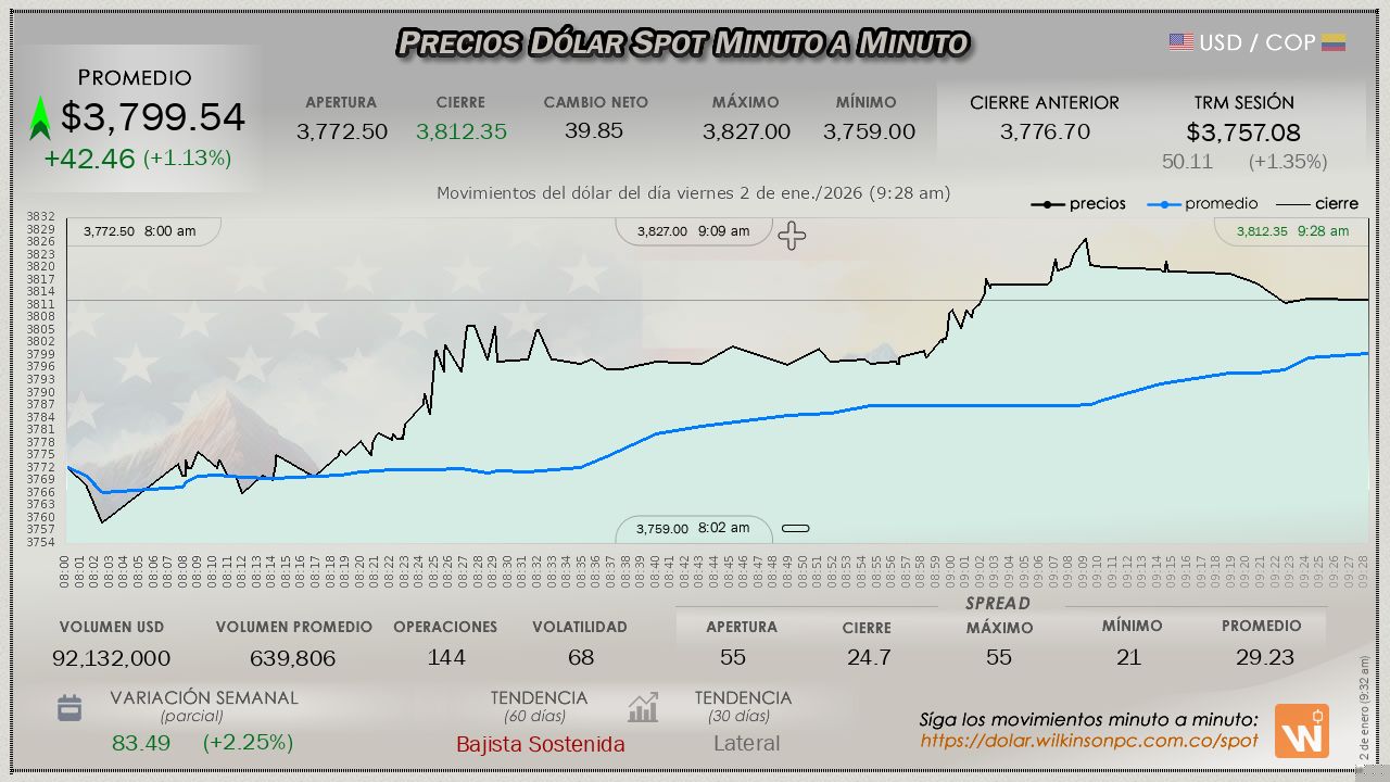 En lo transcurrido hasta el momento de la sesión del día viernes, la primera sesión del año, el dólar mantiene un firme movimiento ascendente manifestado desde el comienzo del día, con un precio promedio de $3,799.54, marcando una tendencia alcista notable, alejándose de la TRM por $42.46 pesos (incrementando las ganancias de la sesión anterior), la TRM en cuestión establecida en $3,757.08 para la sesión.