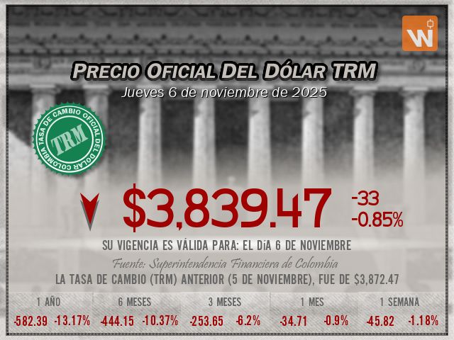 Esta es la TRM vigente del jueves 6 de noviembre de 2025. Un (1) dólar estadounidense equivale a $3,839.47 (tres mil ochocientos treinta y nueve pesos con cuarenta y siete centavos colombianos).