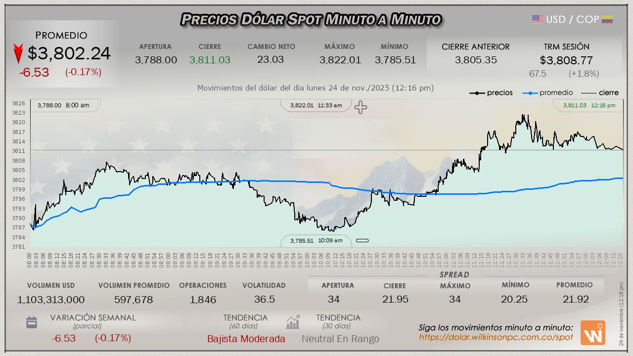 A través de la jornada de hoy, en el mercado SPOT, el dólar ha conservado una recuperación sólo respecto a la apertura de la sesión, con un precio medio de $3,797.18, quedándose sutilmente por debajo de los $-11.59 pesos (aún con la tendencia a la baja, no consigue erosionar las ganancias de la jornada previa), respecto a la Tasa Representativa del Mercado (TRM), definida en $3,808.77 pesos.