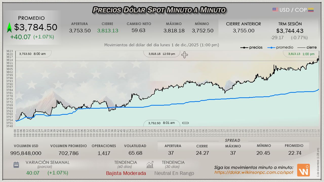 En el mercado SPOT, el dólar finalizó la jornada del lunes, evidenciando una sólida tendencia alcista desde el inicio de la jornada, con un precio promedio de $3,784.50, terminó experimentando un incremento significativo, superando la Tasa Representativa del Mercado (TRM) por un margen de $40.07 pesos, la TRM en cuestión establecida en $3,744.43 para la sesión.