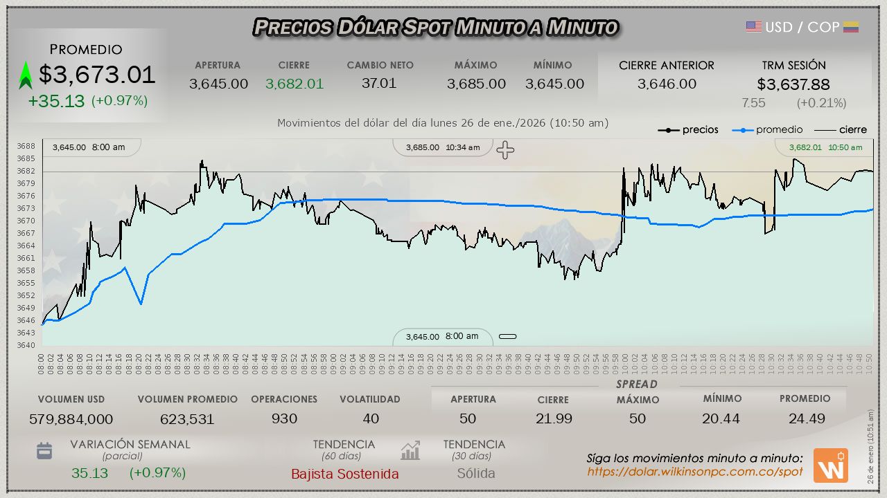 Estas velas reflejan el mercado internacional (Forex). Úselas para analizar tendencias, teniendo en cuenta que el precio puede variar ligeramente respecto al mercado oficial SPOT de Colombia.