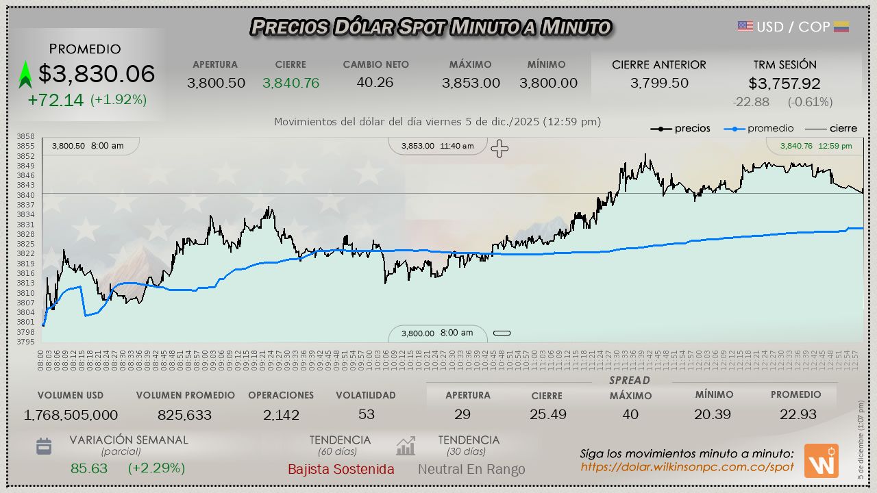El viernes (justo antes del día de las velitas), el mercado SPOT concluyó la jornada evidenciando un firme movimiento ascendente manifestado desde el comienzo del día, el precio promedio se situó en $3,830.06, terminó experimentando un incremento significativo, superando la Tasa Representativa del Mercado (TRM) por un margen de $72.14 pesos, la TRM mencionada asignada en $3,757.92 para la sesión.