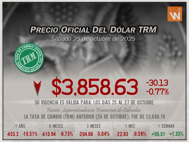 Esta es la TRM vigente del sábado 25 de octubre de 2025, estará en efecto desde la fecha de hoy sábado, hasta el 27 de octubre inclusive. Un (1) dólar estadounidense equivale a $3,858.63 (tres mil ochocientos cincuenta y ocho pesos con sesenta y tres centavos colombianos).