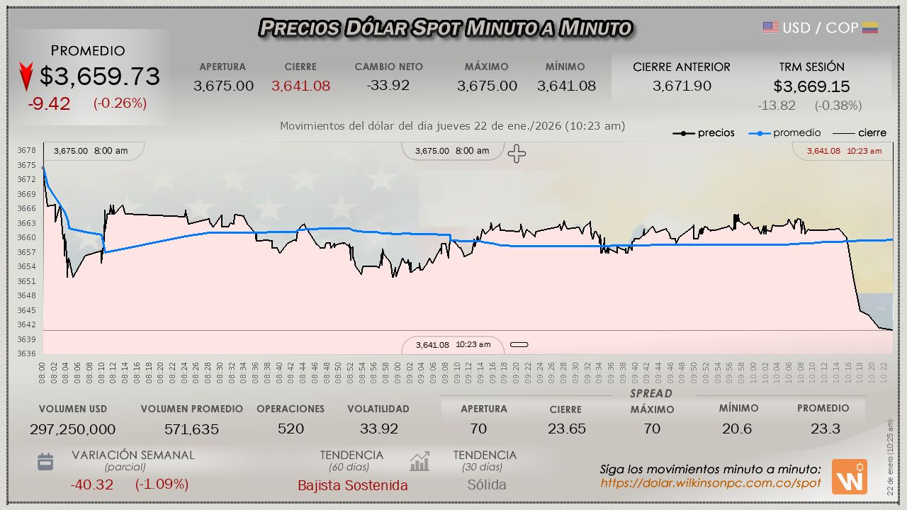 Estas velas reflejan el mercado internacional (Forex). Úselas para analizar tendencias, teniendo en cuenta que el precio puede variar ligeramente respecto al mercado oficial SPOT de Colombia.