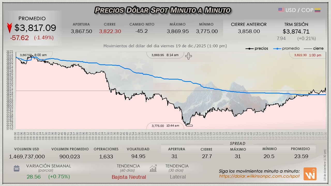 El viernes, en la sesión del mercado SPOT, el dólar muestra un descenso continuado desde que inició la jornada, a un precio corriente de $3,816.82, desplomándose de manera notable frente a la TRM, al perder $-57.89 pesos (descuenta una proporción mayor de las ganancias de la jornada previa), la TRM referida fijada en $3,874.71 para el día.
