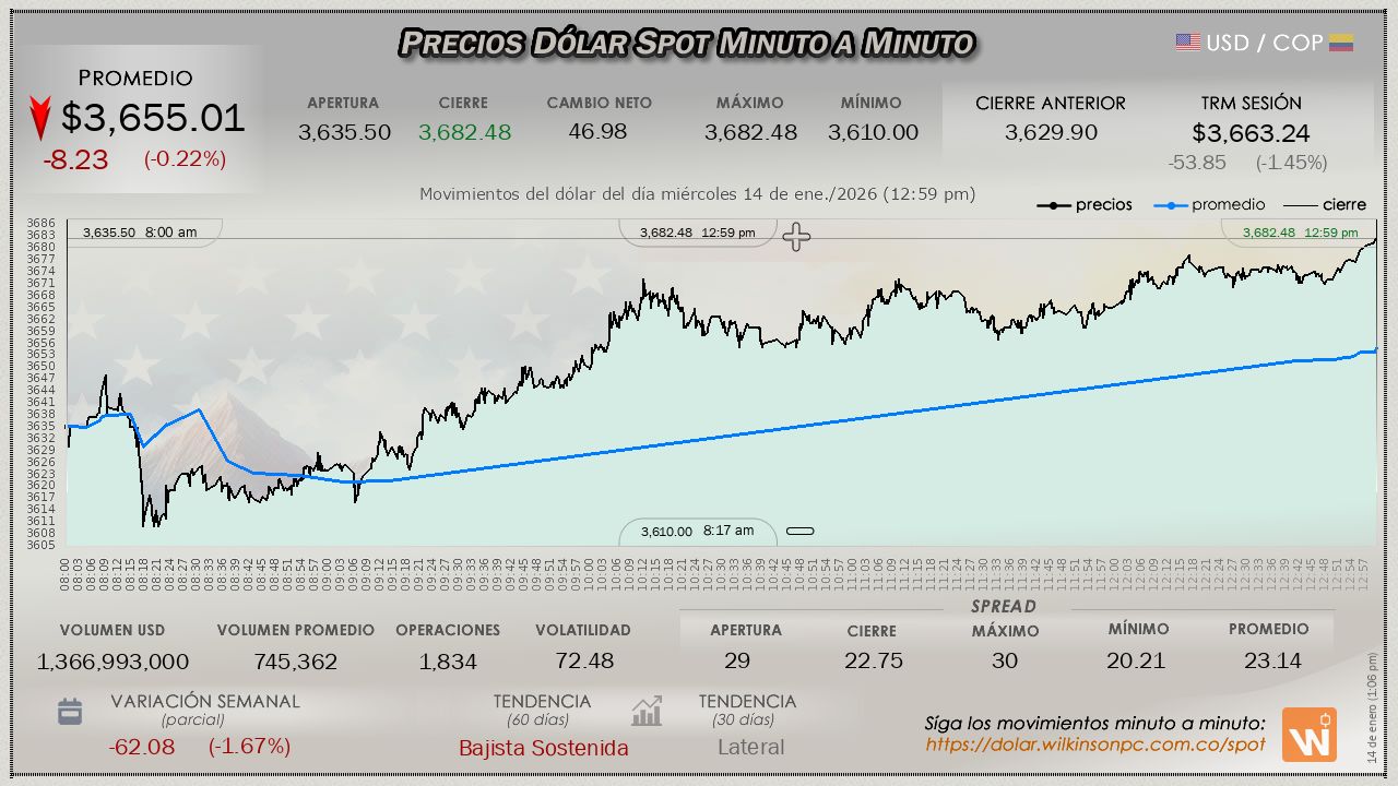 La tasa TRM a la que se liquida el precio del dólar es de $3,663.24, con vigencia para el miércoles 14 de enero de 2026.