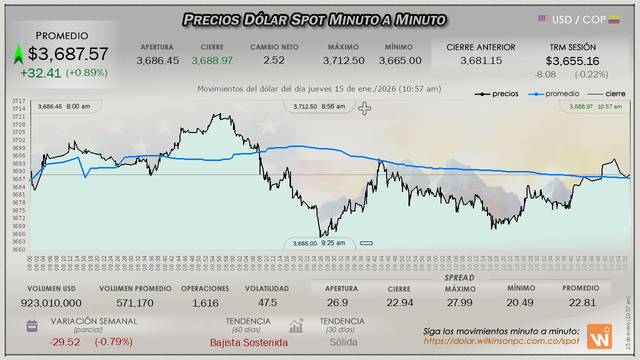 A esta hora del jueves, en la sesión del mercado SPOT, el dólar muestra un firme movimiento ascendente manifestado desde el comienzo del día, con un precio promedio de $3,697.04, marcando una tendencia alcista notable, alejándose de la TRM por $41.88 pesos (una recuperación significativa de las pérdidas de la jornada previa), la TRM establecida para la sesión es de $3,655.16.