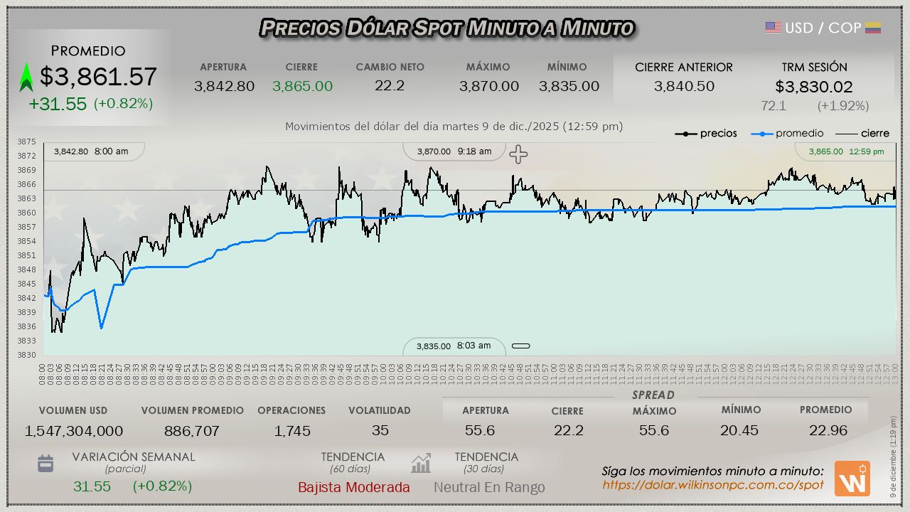 El mercado SPOT concluyó el miércoles, evidenciando una tendencia bajista después de mostrar un impulso inicial que no pudo mantener, el valor medio se situó en $3,854.41, una caída muy leve de $-6.93 pesos respecto a la Tasa Representativa del Mercado (TRM), definida en $3,861.34 pesos.