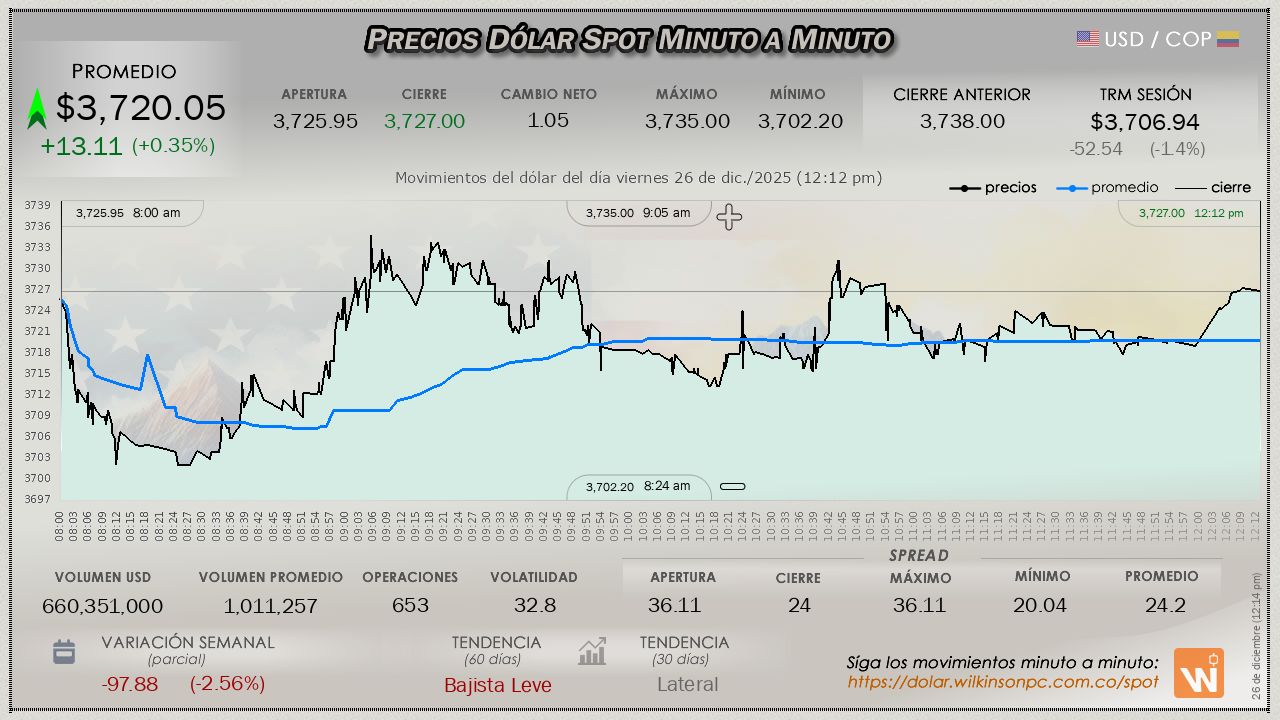 El mercado del dólar SPOT, en la jornada del viernes, tiene una desaceleración después de un aumento inicial, la tendencia se mantiene positiva durante la jornada, a un precio corriente de $3,720.14, rebasándola sutilmente por encima de los $13.20 pesos (aunque hay una tendencia al alza, no logra compensar las pérdidas de la jornada anterior), frente a la TRM vigente, que para la sesión estaba en $3,706.94.