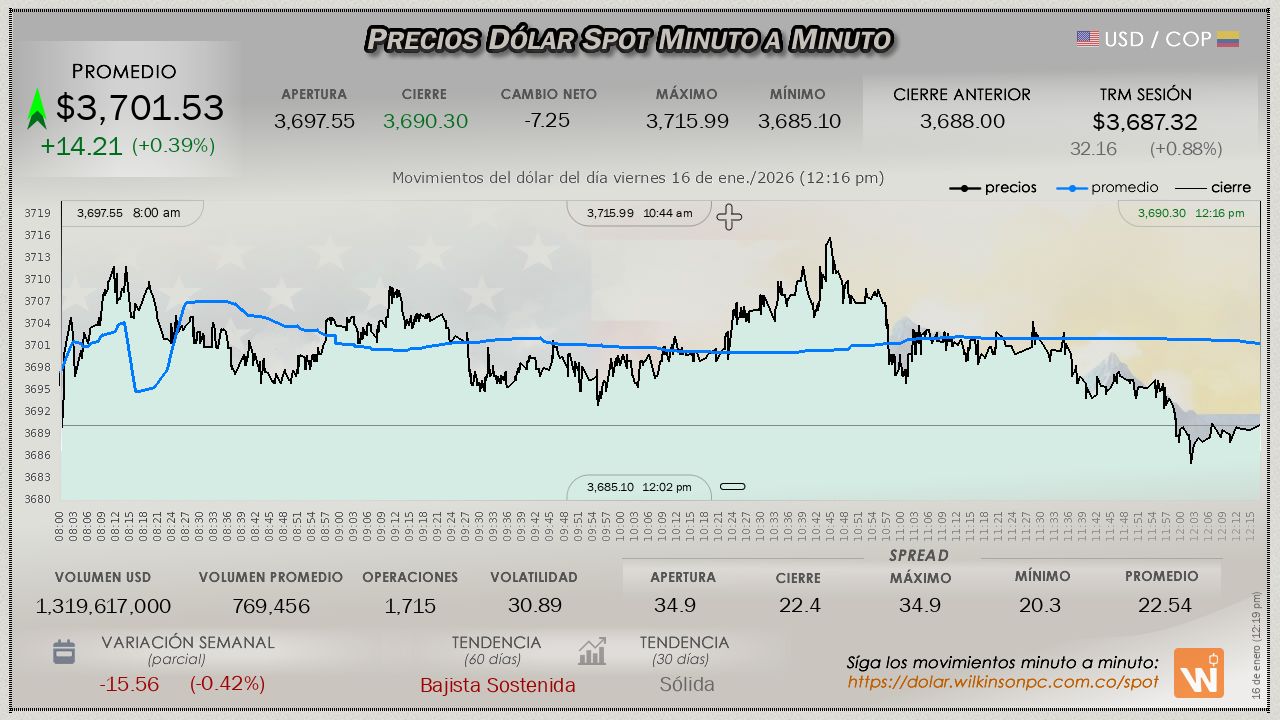 El mercado SPOT concluyó el viernes, evidenciando un firme movimiento ascendente manifestado desde el comienzo del día, el valor medio se situó en $3,700.12, terminó con un margen ligeramente superior de $12.80 pesos en comparación con la Tasa Representativa del Mercado (TRM) vigente, determinada en $3,687.32 para la sesión.