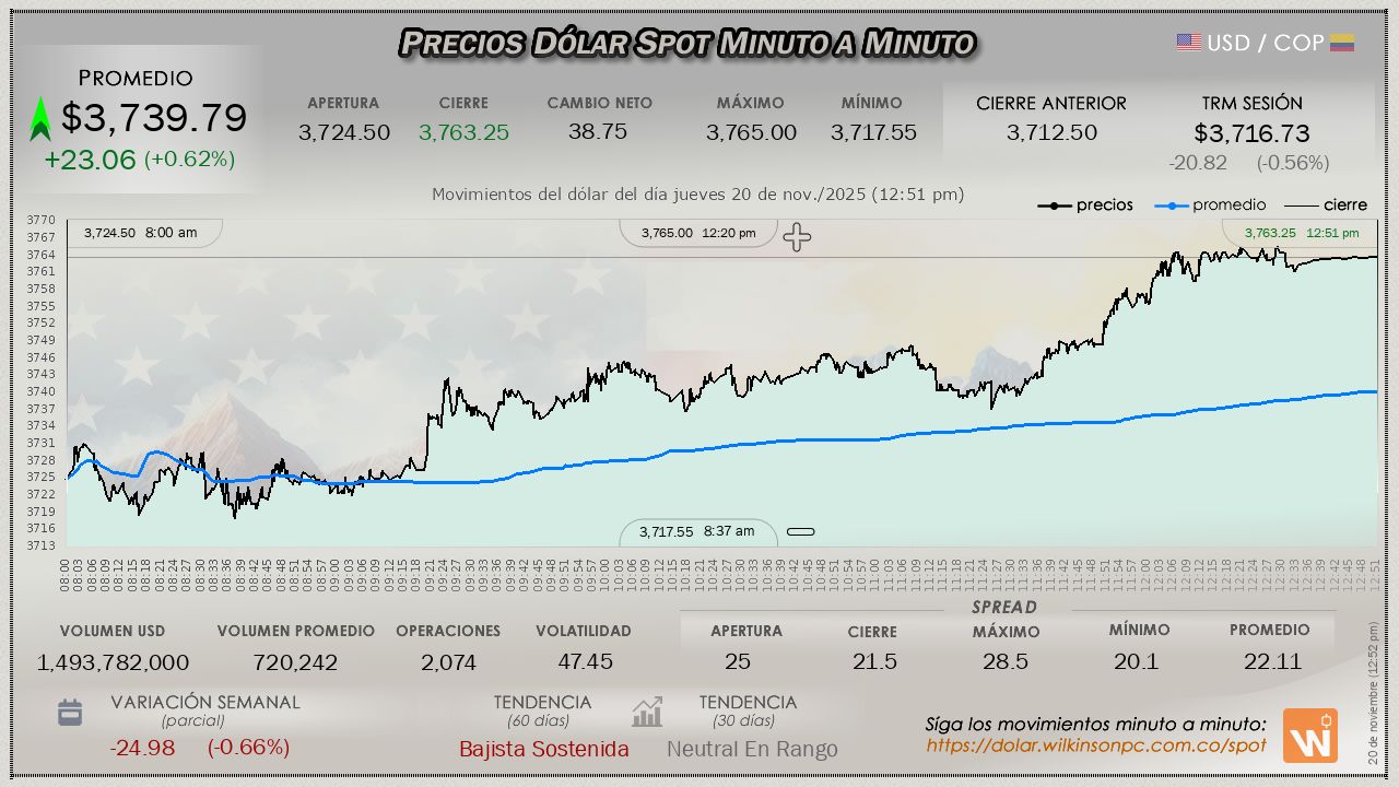 Durante lo que va de sesión, el mercado SPOT del jueves, muestra un incremento consistente desde el comienzo de la jornada, un promedio del dólar en $3,726.25, escasamente por arriba de los $9.52 pesos (a pesar del ascenso, no logra recuperar lo perdido en la sesión anterior), sobre la Tasa Representativa del Mercado (TRM), establecida en $3,716.73 pesos.