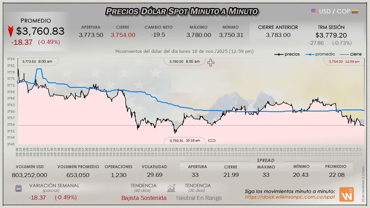 El mercado del dólar SPOT, dió cierre a la jornada del lunes, evidenciando una tendencia a la baja desde el arranque de la sesión, con un precio promedio de $3,760.83, modestamente por debajo de la Tasa Representativa del Mercado (TRM), evidenciando un descuento de $-18.37 pesos, la TRM en cuestión establecida en $3,779.20 para la sesión.