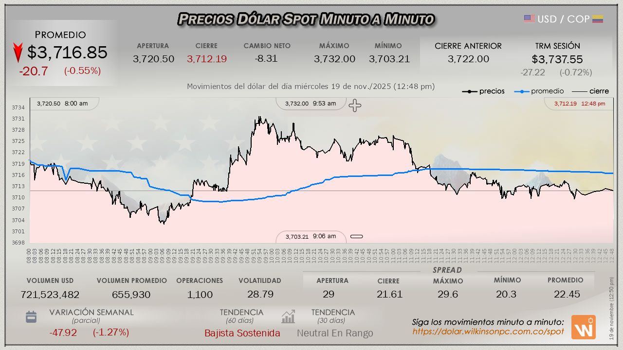 El viernes (en la víspera de la celebración de la Independencia de Cartagena), cerró la jornada del mercado SPOT evidenciando una sólida tendencia alcista desde el inicio de la jornada, con un precio promedio de $3,764.92, terminó experimentando un incremento significativo, superando la Tasa Representativa del Mercado (TRM) por un margen de $45.32 pesos, la TRM establecida para la sesión es de $3,719.60.