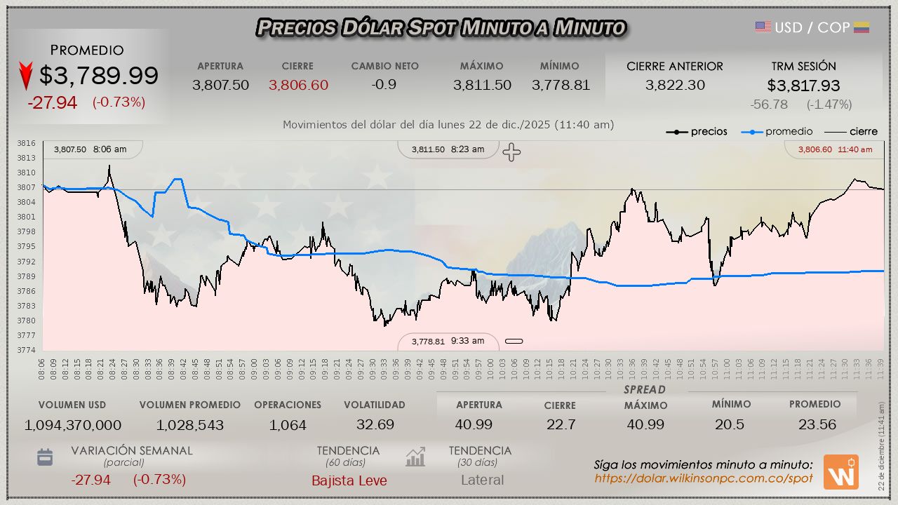 Esta es la TRM vigente del lunes 22 de diciembre de 2025, con validez desde el sábado 20 de diciembre hasta la fecha de hoy. Un (1) dólar estadounidense equivale a $3,817.93 (tres mil ochocientos diecisiete pesos con noventa y tres centavos colombianos).