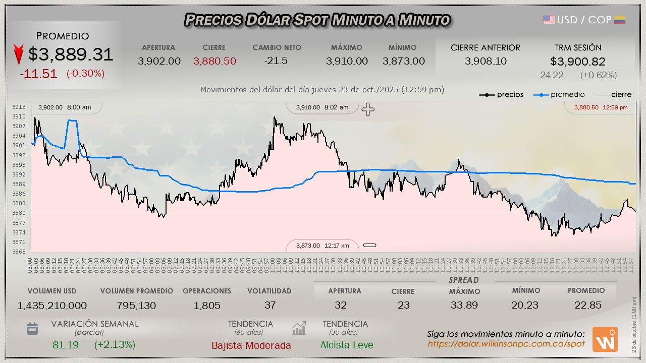 El jueves, el mercado SPOT concluyó la jornada evidenciando un descuento respecto al empuje con el que arrancó el día y continuó descendiendo, el precio promedio se situó en $3,888.91, modestamente por debajo de la Tasa Representativa del Mercado (TRM), evidenciando un descuento de $-11.91 pesos, la TRM referida fijada en $3,900.82 para el día.