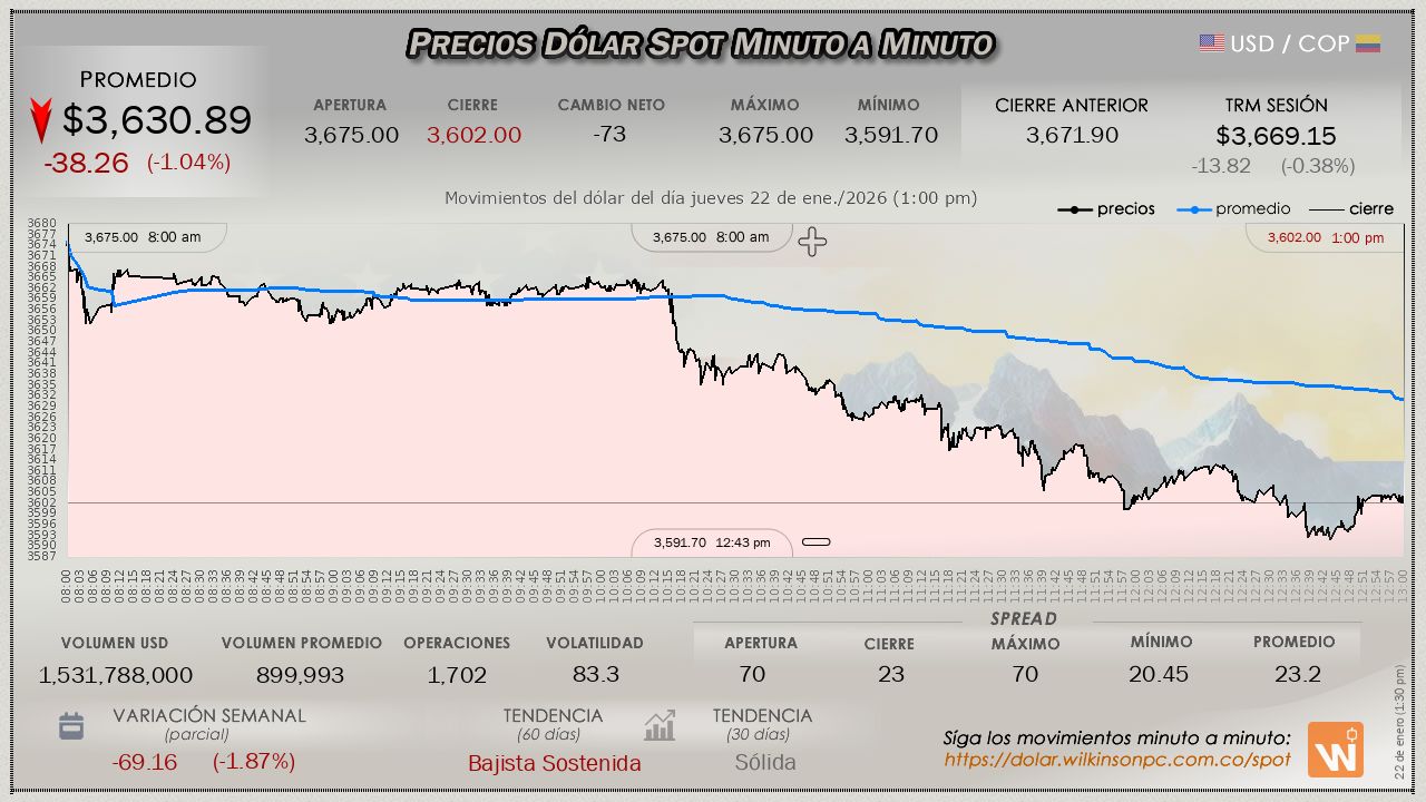 Estas velas reflejan el mercado internacional (Forex). Úselas para analizar tendencias, teniendo en cuenta que el precio puede variar ligeramente respecto al mercado oficial SPOT de Colombia.