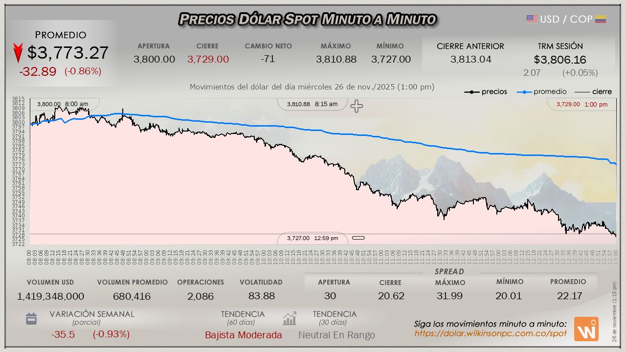 El mercado SPOT concluyó el miércoles, evidenciando un descenso continuado desde que inició la jornada, el valor medio se situó en $3,773.27, alejándose significativamente de la Tasa Representativa del Mercado (TRM), perdiendo $-32.89 pesos, dicha TRM fijada en $3,806.16 para la sesión.