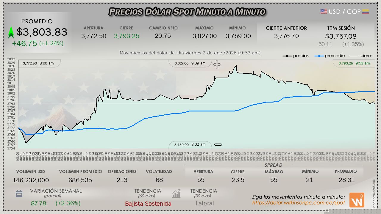 A esta hora el mercado SPOT del día viernes, la primera sesión del año, mantiene un firme movimiento ascendente manifestado desde el comienzo del día, con un valor promedio de $3,803.83, experimentando un incremento significativo, superando la TRM por un margen de $46.75 pesos (incrementando las ganancias de la sesión anterior), la TRM en cuestión establecida en $3,757.08 para la sesión.