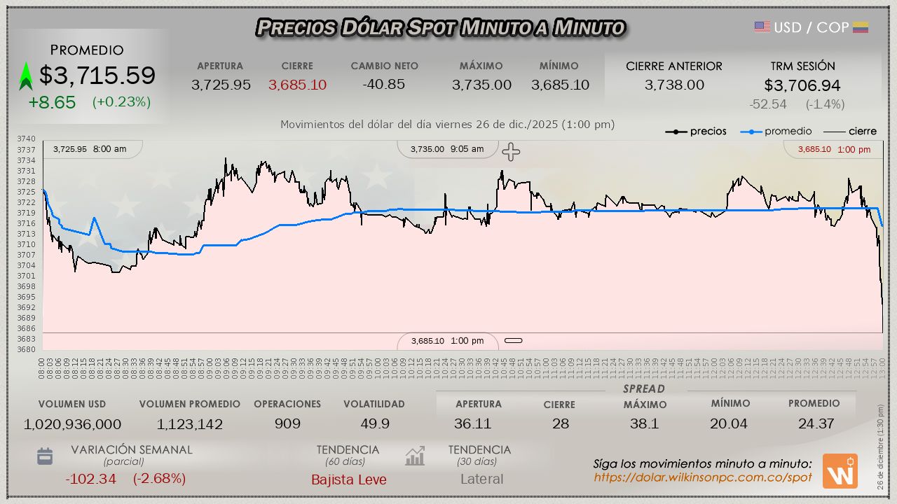 La tasa TRM a la que se liquida el precio del dólar es de $3,706.94, con vigencia para el viernes 26 de diciembre de 2025.