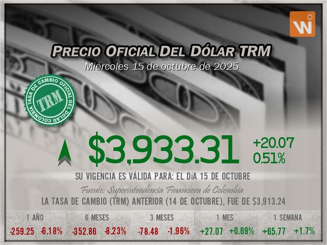 Esta es la TRM vigente del miércoles 15 de octubre de 2025. Un (1) dólar estadounidense equivale a $3,933.31 (tres mil novecientos treinta y tres pesos con treinta y un centavos colombianos).