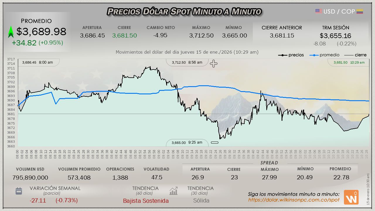 En el recién iniciado mercado SPOT del jueves, el dólar observa un firme movimiento ascendente manifestado desde el comienzo del día, con un precio promedio de $3,691.55, marcando una tendencia alcista notable, alejándose de la TRM por $36.39 pesos (experimenta una recuperación vigorosa de las pérdidas de la sesión anterior), la TRM mencionada asignada en $3,655.16 para la sesión.