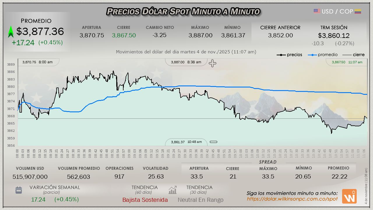 En el transcurso del día martes (muy cerca del día de nuestra Policía Nacional), el dólar ha mantenido un incremento consistente desde el comienzo de la jornada, con un valor corriente de $3,877.36, por encima de la Tasa Representativa del Mercado (TRM), superándola en $17.24 pesos (rebotando de las caídas de la jornada previa), la TRM referida fijada en $3,860.12 para el día.