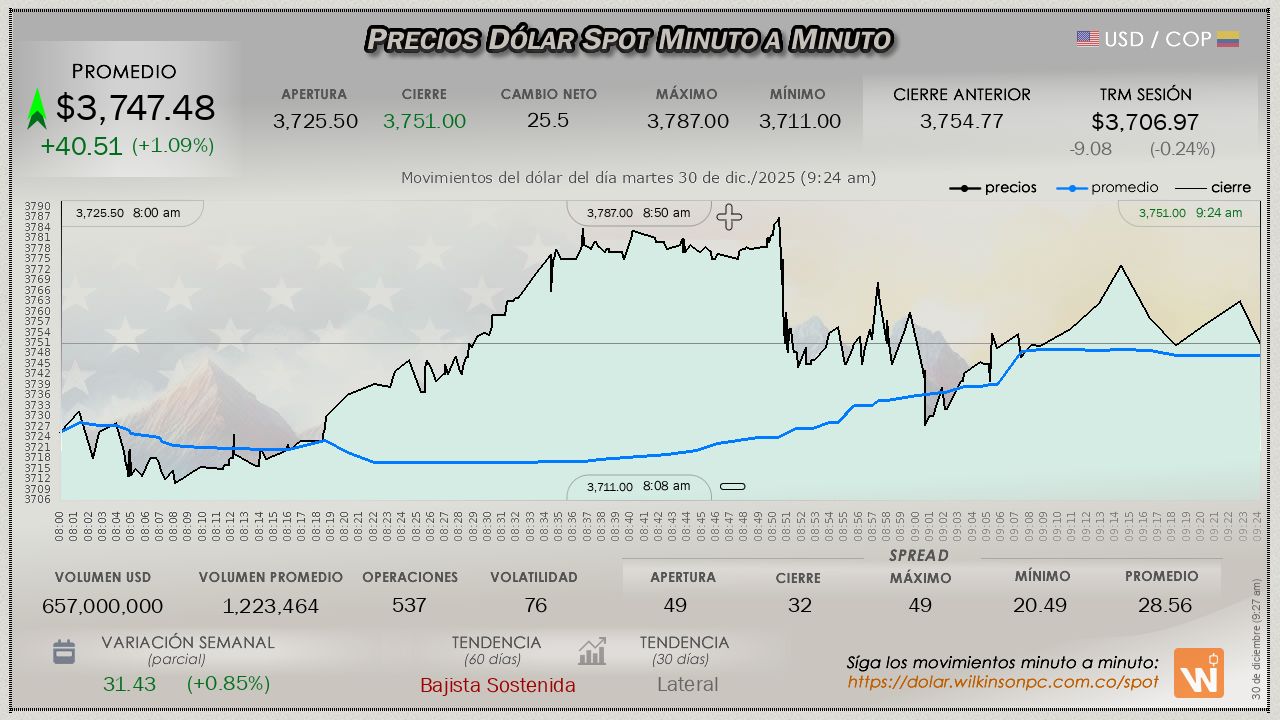 A esta hora el mercado SPOT del día martes, la última sesión del año (justo antes de la celebración de Año Nuevo), mantiene un incremento consistente desde el comienzo de la jornada, con un precio medio de $3,747.48, experimentando un incremento significativo, superando la TRM por un margen de $40.51 pesos (una recuperación significativa de las pérdidas de la jornada previa), la TRM referida fijada en $3,706.97 para el día.