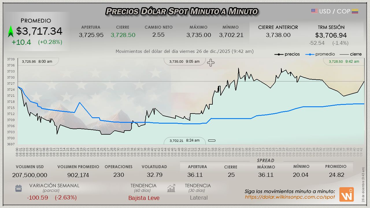 La tasa TRM a la que se liquida el precio del dólar es de $3,706.94, con vigencia para el viernes 26 de diciembre de 2025.