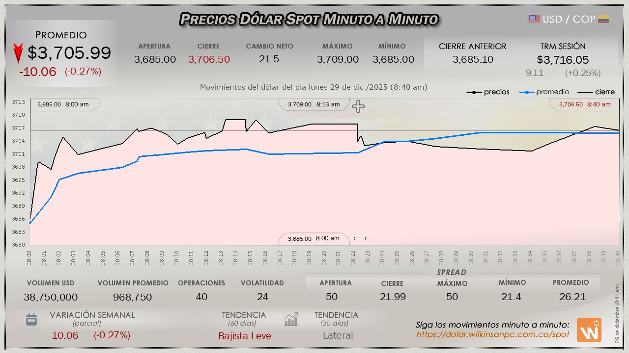 El mercado del dólar SPOT, a primera hora del lunes, tiene una recuperación sólo respecto a la apertura de la sesión, con un valor corriente de $3,705.99, quedándose sutilmente por debajo de los $-10.06 pesos (una erosión sutil de las ganancias de la jornada previa), frente al precio de referencia, fijada en $3,716.05 para la sesión.