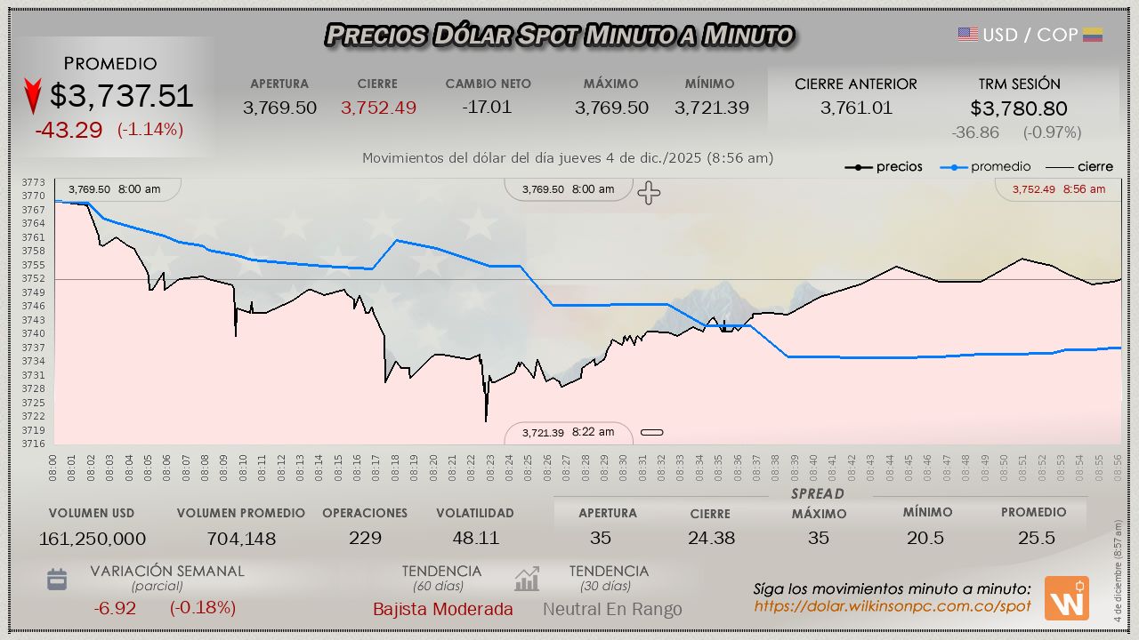 En el recién iniciado mercado SPOT del jueves, el dólar observa un descenso continuado desde la apertura, a un precio corriente de $3,761.00, con un margen por debajo de la Tasa Representativa del Mercado (TRM), inferior en $-19.80 pesos (aumentando las pérdidas de la sesión anterior), la TRM en cuestión establecida en $3,780.80 para la sesión.