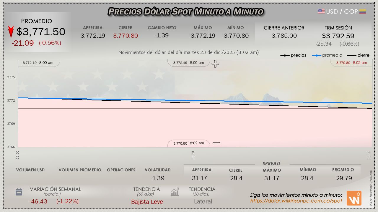 A esta hora el mercado SPOT del día martes, muestra un descenso continuado desde que inició la jornada, a un precio corriente de $3,771.50, con un margen por debajo de la TRM, siendo inferior en $-21.09 pesos (aumentando las pérdidas de la sesión anterior), la TRM establecida para la sesión es de $3,792.59.