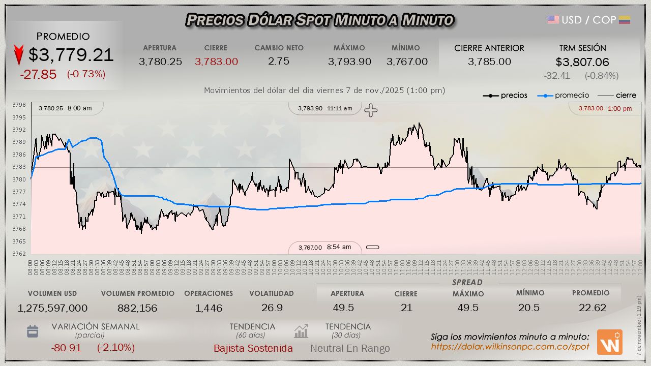 El mercado del dólar SPOT, dió cierre a la jornada del viernes (antes del día de la Fuerza Aérea), evidenciando un descenso continuado desde la apertura, con un precio promedio de $3,779.21, modestamente por debajo de la Tasa Representativa del Mercado (TRM), evidenciando un descuento de $-27.85 pesos, la TRM establecida para la sesión es de $3,807.06.