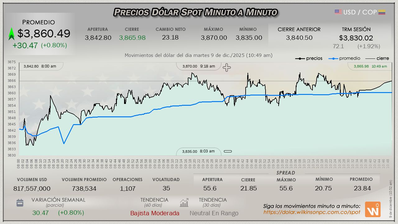 El mercado SPOT concluyó el miércoles, evidenciando una tendencia bajista después de mostrar un impulso inicial que no pudo mantener, el valor medio se situó en $3,854.41, una caída muy leve de $-6.93 pesos respecto a la Tasa Representativa del Mercado (TRM), definida en $3,861.34 pesos.