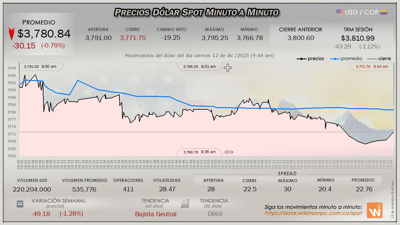 El mercado del dólar SPOT, a primera hora del viernes, tiene un descenso continuado desde la apertura, con un precio promedio de $3,787.26, con una desventaja sobre la Tasa Representativa del Mercado (TRM), de $-23.73 pesos (aumentando las pérdidas de la sesión anterior), dicha TRM fijada en $3,810.99 para la sesión.