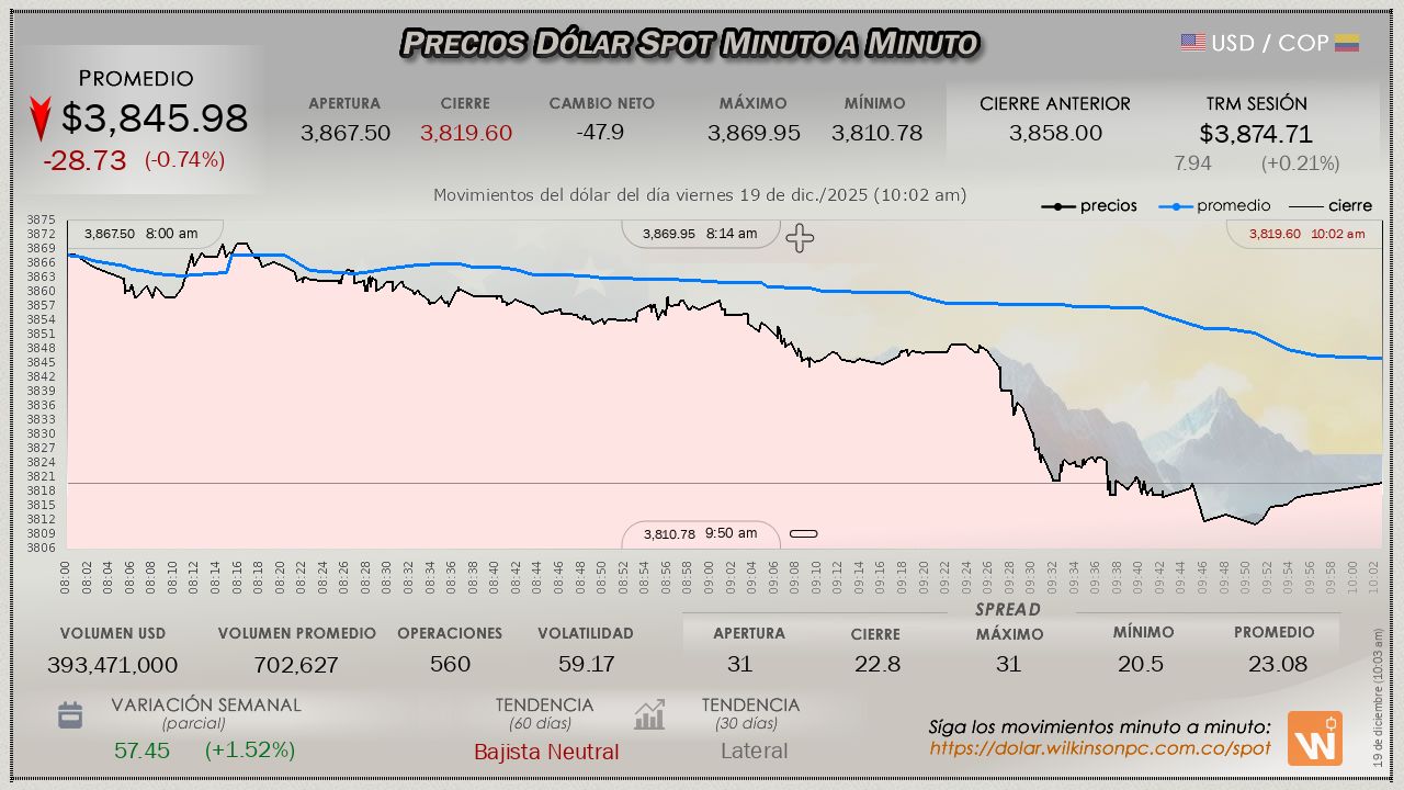 En lo transcurrido hasta el momento de la sesión del día viernes, el dólar mantiene un descenso continuado desde la apertura, con un valor medio de $3,846.26, con un margen por debajo de la TRM, siendo inferior en $-28.45 pesos (una erosión considerable de las ganancias de la sesión anterior), la TRM mencionada asignada en $3,874.71 para la sesión.