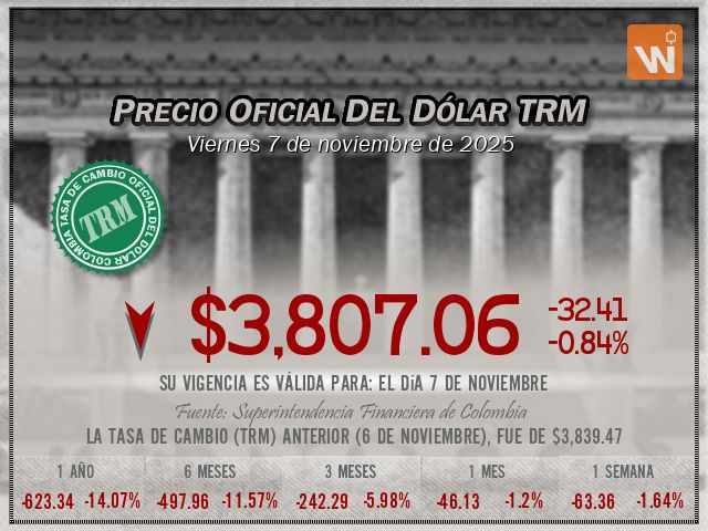La tasa TRM a la que se liquida el precio del dólar es de $3,807.06, con vigencia para el viernes 7 de noviembre de 2025.
