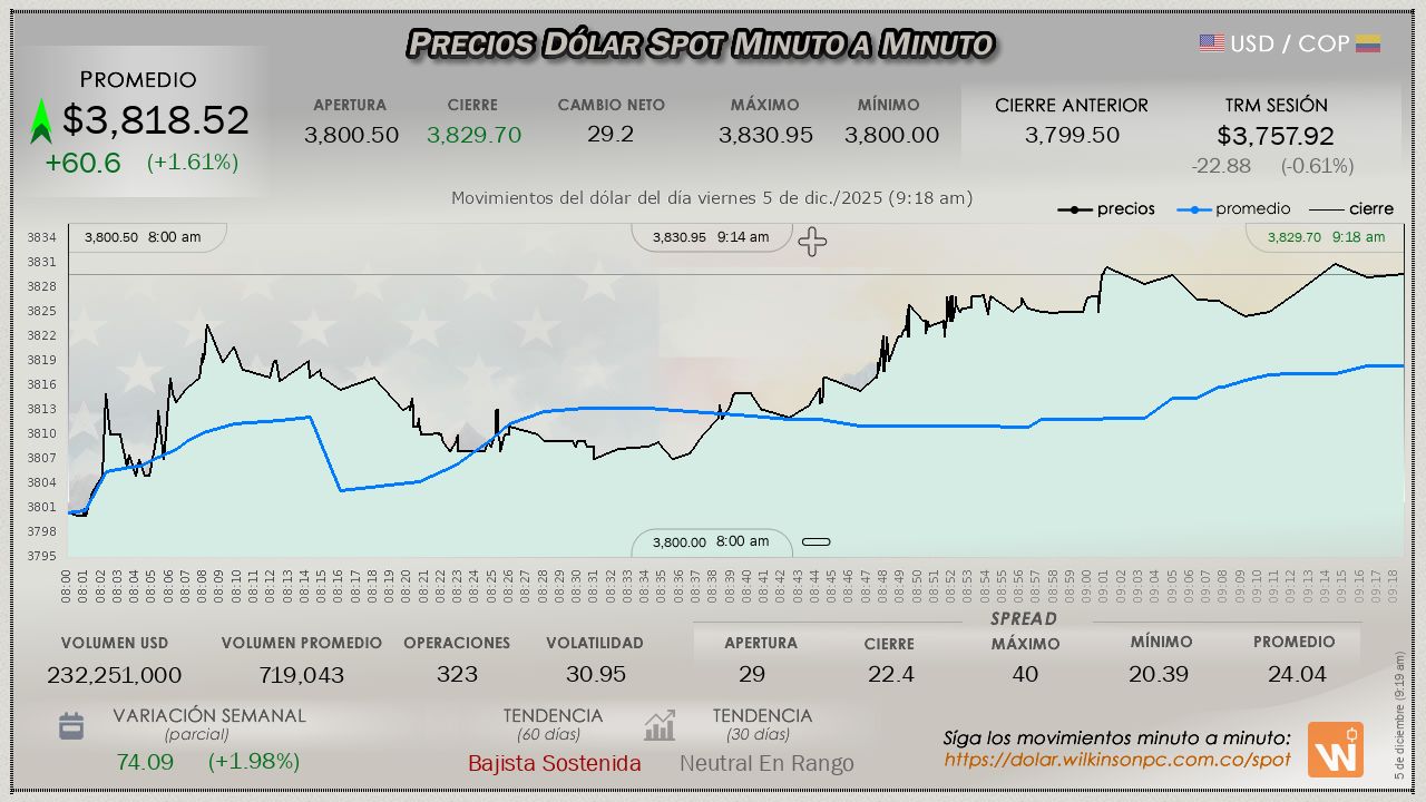 El mercado del dólar SPOT, a primera hora del viernes (justo antes del día de las velitas), tiene un firme movimiento ascendente manifestado desde el comienzo del día, con un precio medio de $3,812.94, experimentando un incremento significativo, superando la Tasa Representativa del Mercado (TRM) por un margen de $55.02 pesos (experimenta una recuperación vigorosa de las pérdidas de la sesión anterior), la TRM mencionada asignada en $3,757.92 para la sesión.