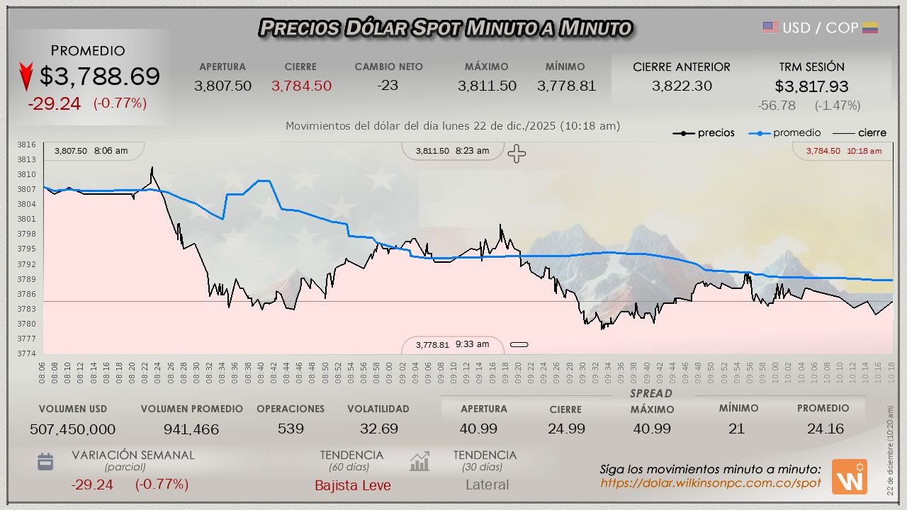 Esta es la TRM vigente del lunes 22 de diciembre de 2025, con validez desde el sábado 20 de diciembre hasta la fecha de hoy. Un (1) dólar estadounidense equivale a $3,817.93 (tres mil ochocientos diecisiete pesos con noventa y tres centavos colombianos).