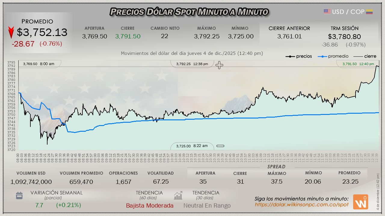 En el mercado SPOT, el dólar en la jornada del jueves, observa una tendencia a la baja desde el arranque de la sesión, a un precio corriente de $3,750.71, desplomándose de manera notable de la Tasa Representativa del Mercado (TRM), al perder $-30.09 pesos (ampliando las pérdidas de la jornada previa), la TRM en cuestión establecida en $3,780.80 para la sesión.
