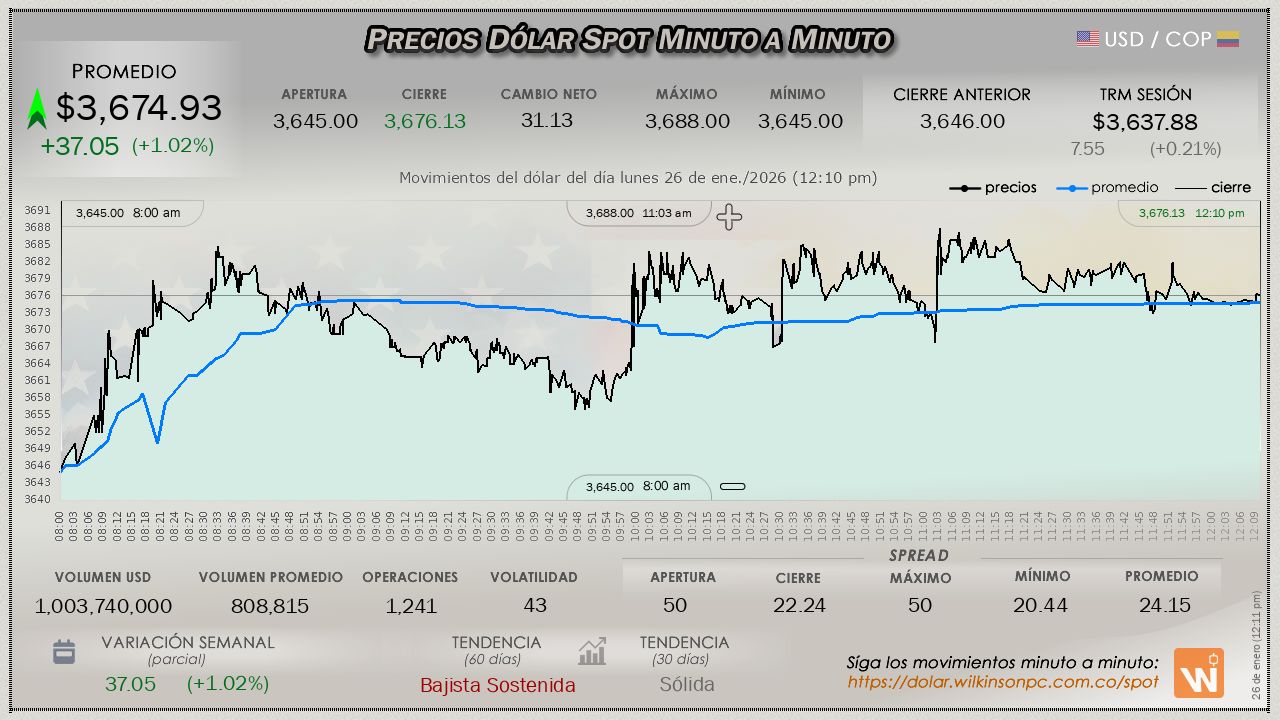 Estas velas reflejan el mercado internacional (Forex). Úselas para analizar tendencias, teniendo en cuenta que el precio puede variar ligeramente respecto al mercado oficial SPOT de Colombia.