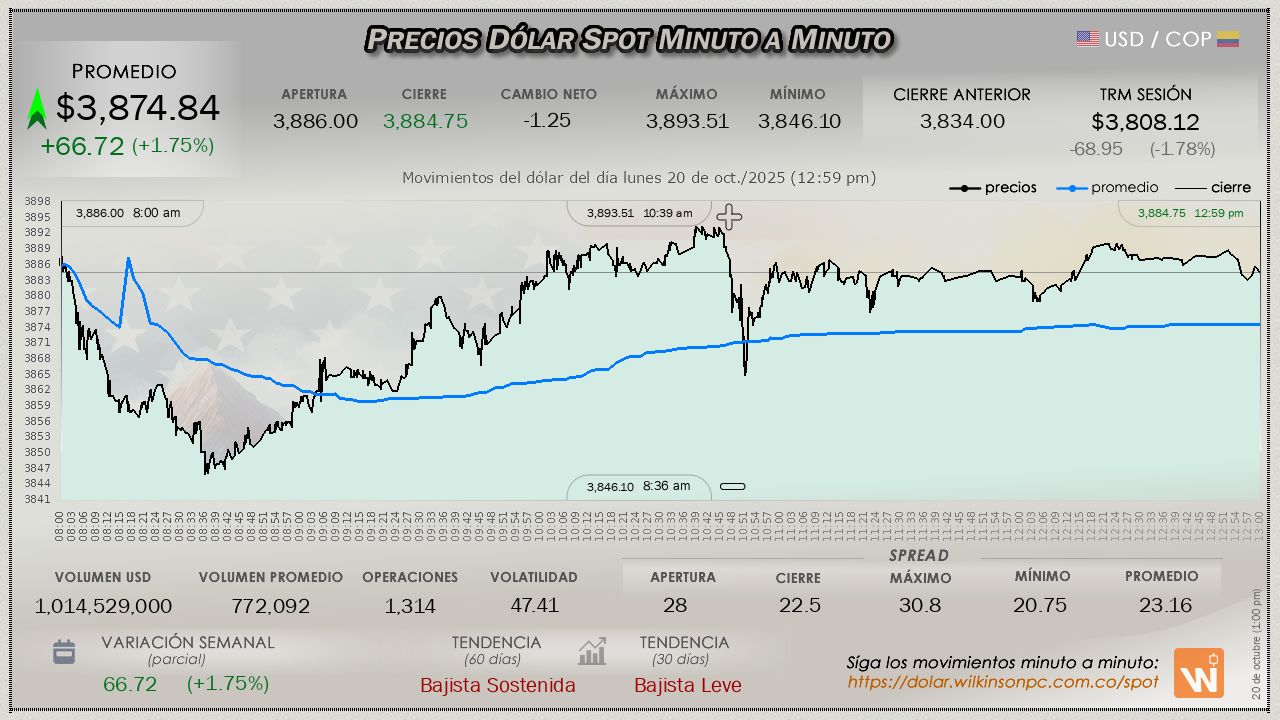 El mercado del dólar SPOT, dió cierre a la jornada del lunes, evidenciando una desaceleración después de un aumento inicial, la tendencia se mantuvo positiva durante la jornada, con un precio promedio de $3,875.55, terminó experimentando un incremento significativo, superando la Tasa Representativa del Mercado (TRM) por un margen de $67.43 pesos, la TRM en cuestión establecida en $3,808.12 para la sesión.