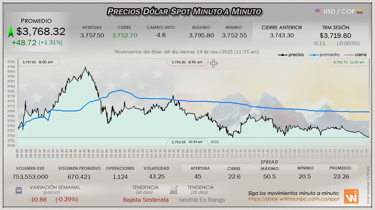 A esta hora el mercado SPOT del día viernes (en la víspera de la celebración de la Independencia de Cartagena), mantiene un firme movimiento ascendente manifestado desde el comienzo del día, a un precio corriente de $3,774.62, experimentando un incremento significativo, superando la Tasa Representativa del Mercado (TRM) por un margen de $55.02 pesos (experimenta una recuperación vigorosa de las pérdidas de la sesión anterior), la TRM referida fijada en $3,719.60 para el día.