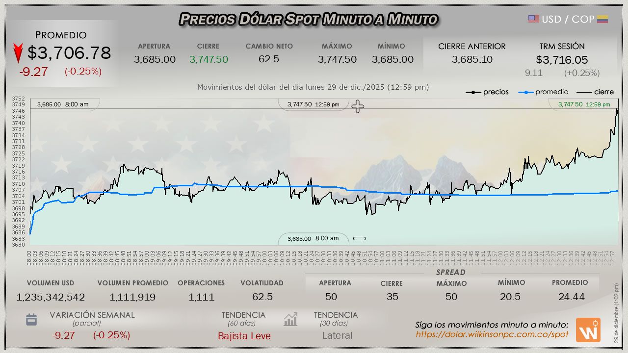 Esta es la TRM vigente del lunes 29 de diciembre de 2025, con validez desde el sábado 27 de diciembre hasta la fecha de hoy. Un (1) dólar estadounidense equivale a $3,716.05 (tres mil setecientos dieciséis pesos con cinco centavos colombianos).