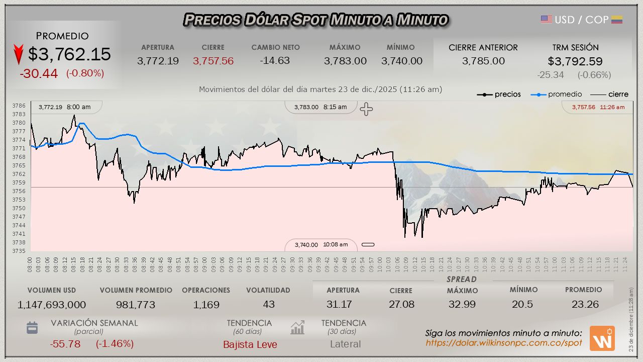 En lo transcurrido hasta el momento de la sesión del día martes, el dólar mantiene un descenso continuado desde que inició la jornada, a un precio corriente de $3,766.03, con un margen por debajo de la TRM, siendo inferior en $-26.56 pesos (aumentando las pérdidas de la sesión anterior), dicha TRM fijada en $3,792.59 para la sesión.