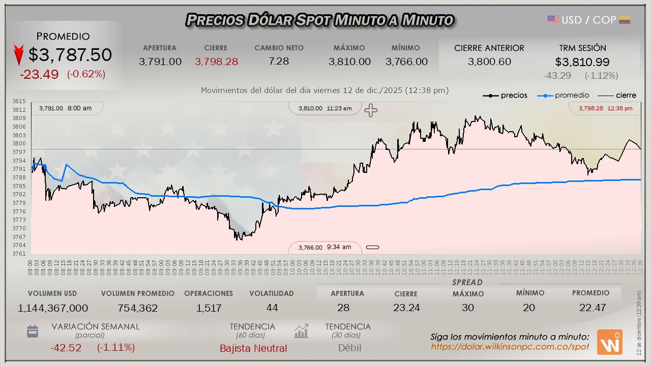 El cierre del mercado SPOT del día jueves, evidenció un descenso continuado desde que inició la jornada, con un precio promedio de $3,810.89, alejándose significativamente de la Tasa Representativa del Mercado (TRM), perdiendo $-43.39 pesos, la TRM referida fijada en $3,854.28 para el día.