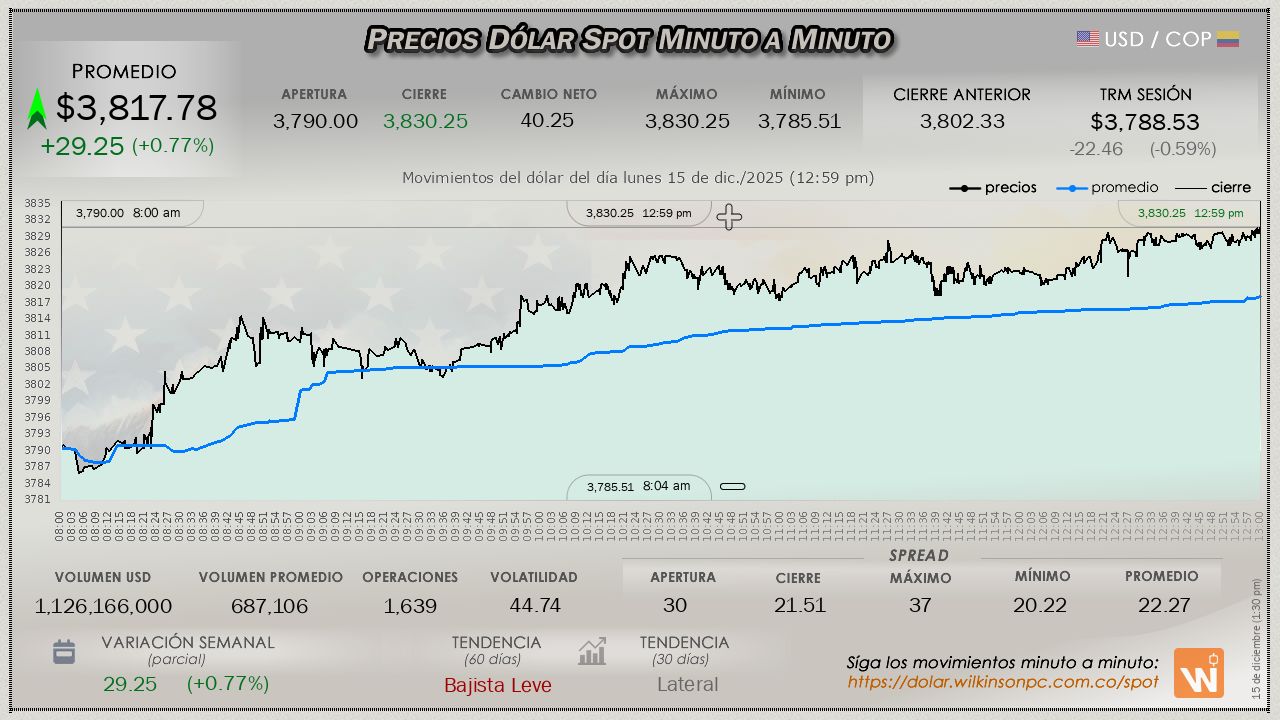 En el transcurso del día lunes (previo al inicio de la Novena de Aguinaldos), el dólar ha mantenido un incremento consistente desde el comienzo de la jornada, con un precio promedio de $3,815.31, un margen por encima de la Tasa Representativa del Mercado (TRM), aventajándola en $26.78 pesos (una recuperación leve de las pérdidas de la sesión anterior), la TRM establecida para la sesión es de $3,788.53.