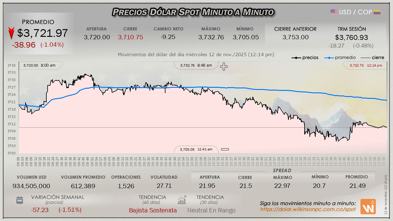 En lo que va de la jornada del mercado SPOT del miércoles, el dólar muestra una recuperación sólo respecto a la apertura de la sesión, a un precio corriente de $3,727.09, desplomándose de manera notable de la Tasa Representativa del Mercado (TRM), al perder $-33.84 pesos (ampliando las pérdidas de la jornada previa), la TRM referida fijada en $3,760.93 para el día.